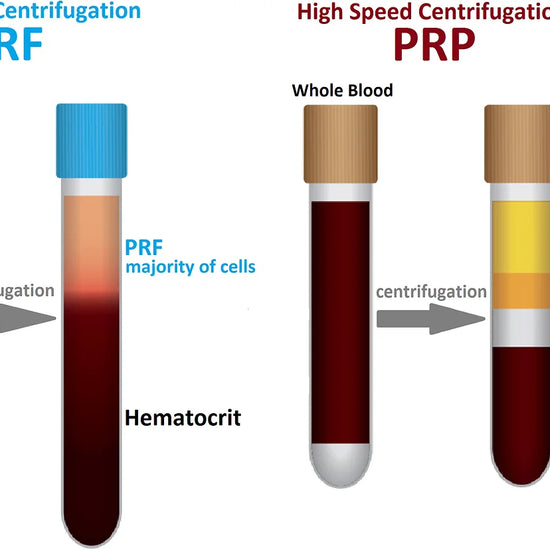 PRF is the next-generation PRP! Platelet Rich Fibrin is the result of blood spun in the Centrifuged at a low speed which makes the layers of blood not as distinct as PRP. In doing this, the white blood cells, stem cells (growth factors), platelets and plasma are able to be collected without the anticoagulant additive.